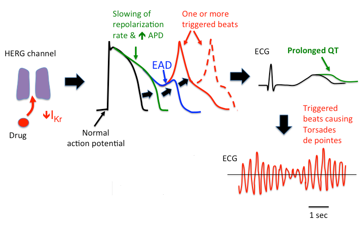 hERG: Block of this channel can slow repolarization, prolong action potential duration, and lead to early after-depolarizations (EADs). This is manifested on an ECG as QT prolongation and can degenerate into a particular type of ventricular arrhythmia, Torsades de pointes.